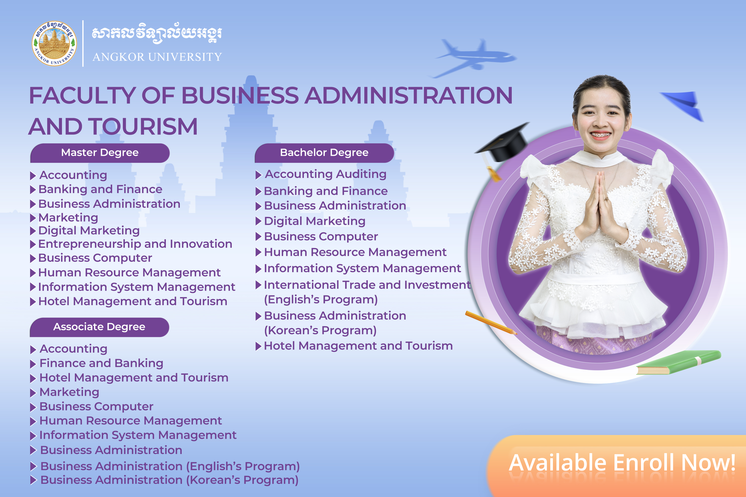 Exploring the Dynamic World of Business and Tourism: A Journey of Growth and Success. In today's rapidly evolving global landscape, the fields of business, finance and tourism stand as pillars of economic prosperity and cultural exchange. Faculty of Business Administration and Tourism (FBAT) offers a comprehensive educational experience that equips students with the knowledge, skills, and entrepreneurial spirit to navigate the complexities of these dynamic industries. 1. Unleash Your Entrepreneurial Spirit; 2. Gain a Competitive Edge in the Business World; 3. Become a Champion of Sustainable Tourism; 4. Develop Exceptional Communication and Interpersonal Skills; 5. Embrace Global Perspectives and Cultural Sensitivity; 6. Launch a Rewarding and Fulfilling Career; 7. Become a Change Maker in the Industry; 8. Cultivate Lifelong Learning and Adaptability. Step into FBAT and embark on a journey of transformative learning, professional growth, and personal fulfillment. Discover the power of business and tourism to shape a brighter future for yourself, your community, and the world at large.