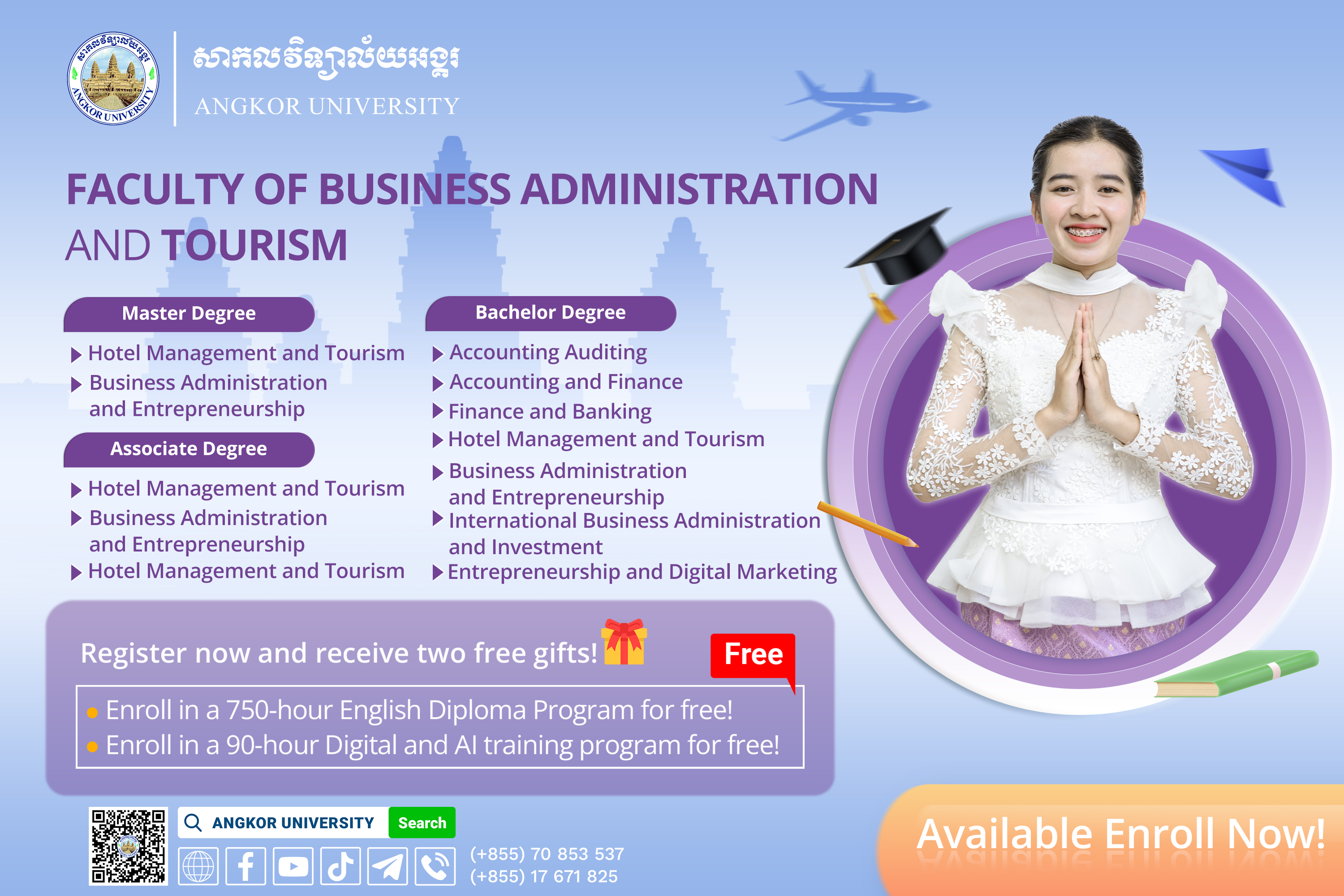 Exploring the Dynamic World of Business and Tourism: A Journey of Growth and Success. In today's rapidly evolving global landscape, the fields of business, finance and tourism stand as pillars of economic prosperity and cultural exchange. Faculty of Business Administration and Tourism (FBAT) offers a comprehensive educational experience that equips students with the knowledge, skills, and entrepreneurial spirit to navigate the complexities of these dynamic industries. 1. Unleash Your Entrepreneurial Spirit; 2. Gain a Competitive Edge in the Business World; 3. Become a Champion of Sustainable Tourism; 4. Develop Exceptional Communication and Interpersonal Skills; 5. Embrace Global Perspectives and Cultural Sensitivity; 6. Launch a Rewarding and Fulfilling Career; 7. Become a Change Maker in the Industry; 8. Cultivate Lifelong Learning and Adaptability. Step into FBAT and embark on a journey of transformative learning, professional growth, and personal fulfillment. Discover the power of business and tourism to shape a brighter future for yourself, your community, and the world at large.